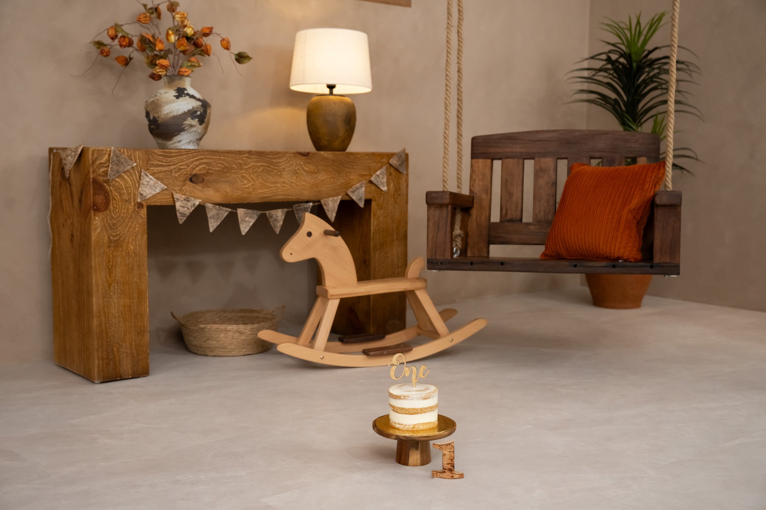 The handcrafted wooden swing adds a gentle storytelling element — ideal for candid, emotive moments between parents and little ones.