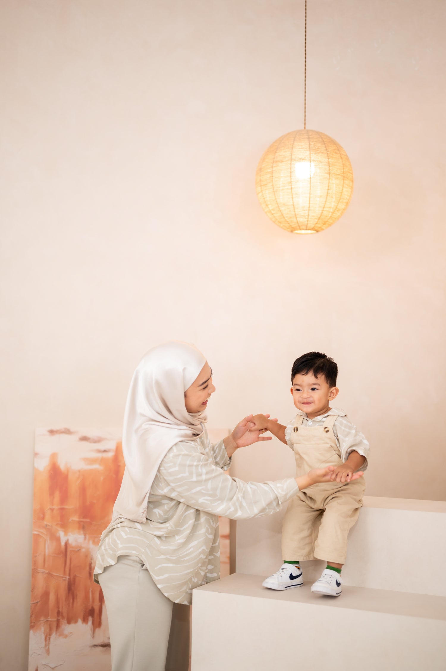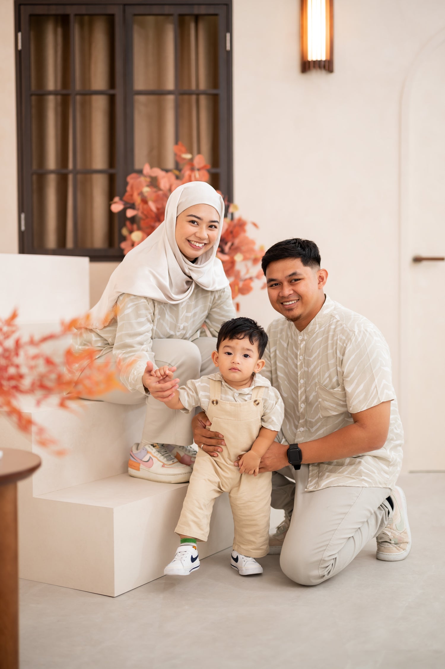 Our Aki setting is a tribute to the serene and cozy ambiance of autumn, featuring elegant, neutral tones highlighted by the vibrant hues of autumn leaves. The soft lighting and thoughtfully arranged props created a perfect backdrop that seamlessly blended with the natural warmth of Nora’s family dynamic. The earthy, beige tones of the set complemented their coordinated outfits, enhancing the overall visual harmony of the shoot.